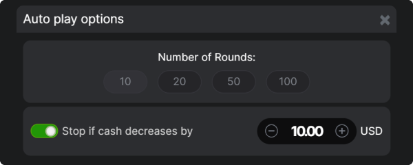 There is an “Autoplay” button at the top of the screen. If you select this option, your wagers will be made automatically. The cash-out will be decided by the computer rather than you. The mode is allowed to be used for up to 10 rounds. The option comes with a range of settings, like stopping when your balance gets lower than the amount that you have specified.